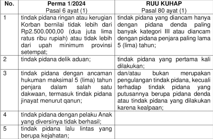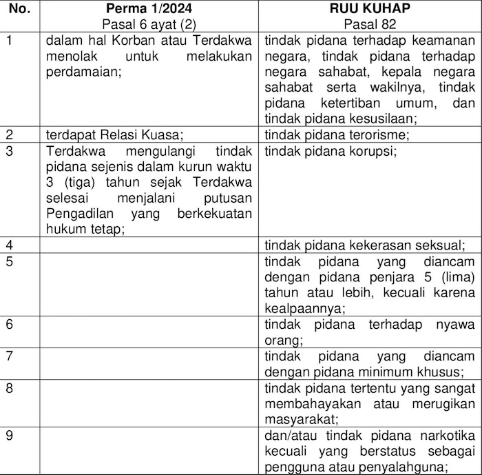 Adapun RUU KUHAP mengatur 3 kriteria perkara yang dapat dilakukan mekanisme keadilan restoratif, dan 9 jenis pengecualiannya.