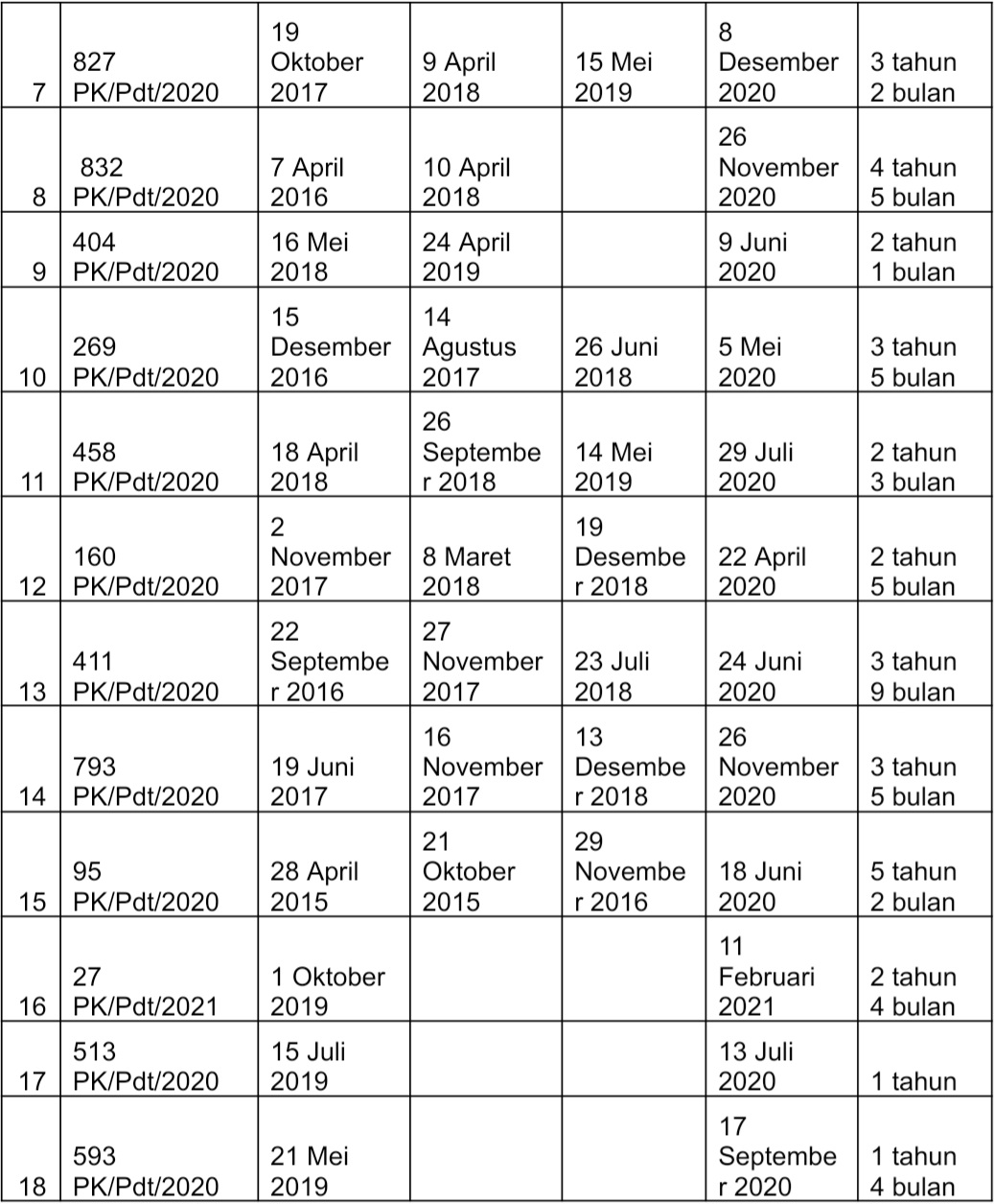 Dari aspek jangka waktu penyelesaian perkara, 7 perkara memerlukan lebih dari 2 tahun untuk penyelesaian dari Tingkat pertama sampai dengan peninjauan Kembali, sedangkan 6 perkara membutuhkan waktu sekitar 3 tahun lebih untuk penyelesaiannya, dan selebihnya 2 perkara menghabiskan waktu lebih dari 4 tahun.