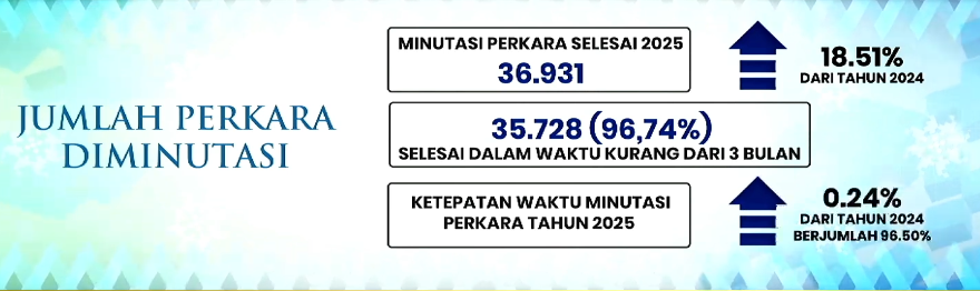 “Jumlah perkara yang berhasil diminutasi dan diselesaikan mencapai 36.931 perkara, meningkat 18,51 persen dibandingkan tahun 2024. Dari total perkara yang diminutasi tersebut, sebanyak 35.728 perkara atau 96,74 persen berhasil diselesaikan dalam waktu kurang dari tiga bulan.