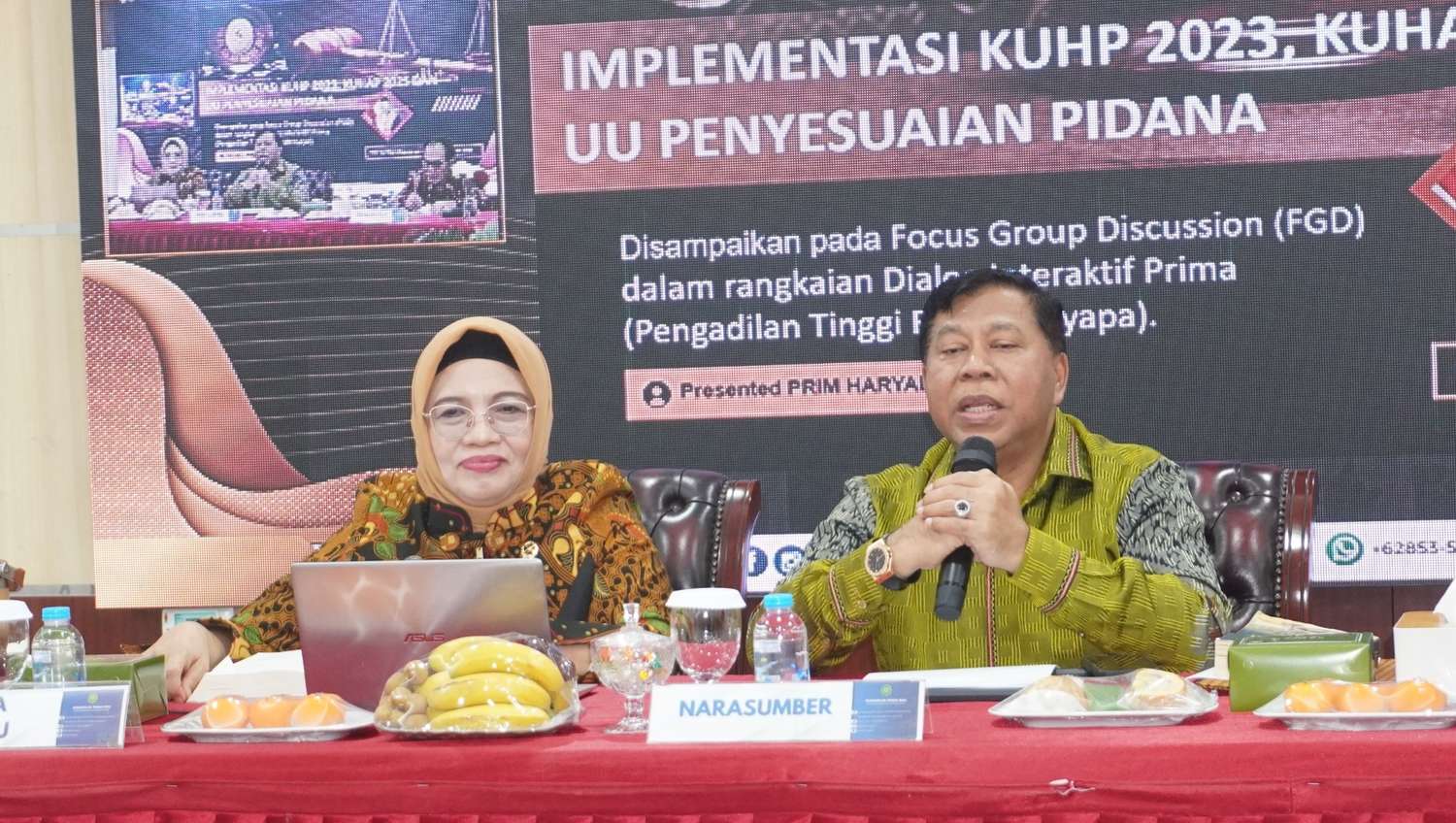 FGD PRIMA dirancang dalam dua sesi strategis yang saling melengkapi antara dimensi filosofis dan implementatif. Pada sesi pertama, hadir Prof. Dr. Harkristuti Harkrisnowo, S.H., M.A., Ph.D., Guru Besar Hukum Pidana Universitas Indonesia dan pakar hukum pidana serta HAM. Sesi ini dipandu oleh Hakim Tinggi Sukri Sulumin, S.H., M.H. sebagai moderator. Mengulas KUHP berdasarkan UU Nomor 1 Tahun 2023.