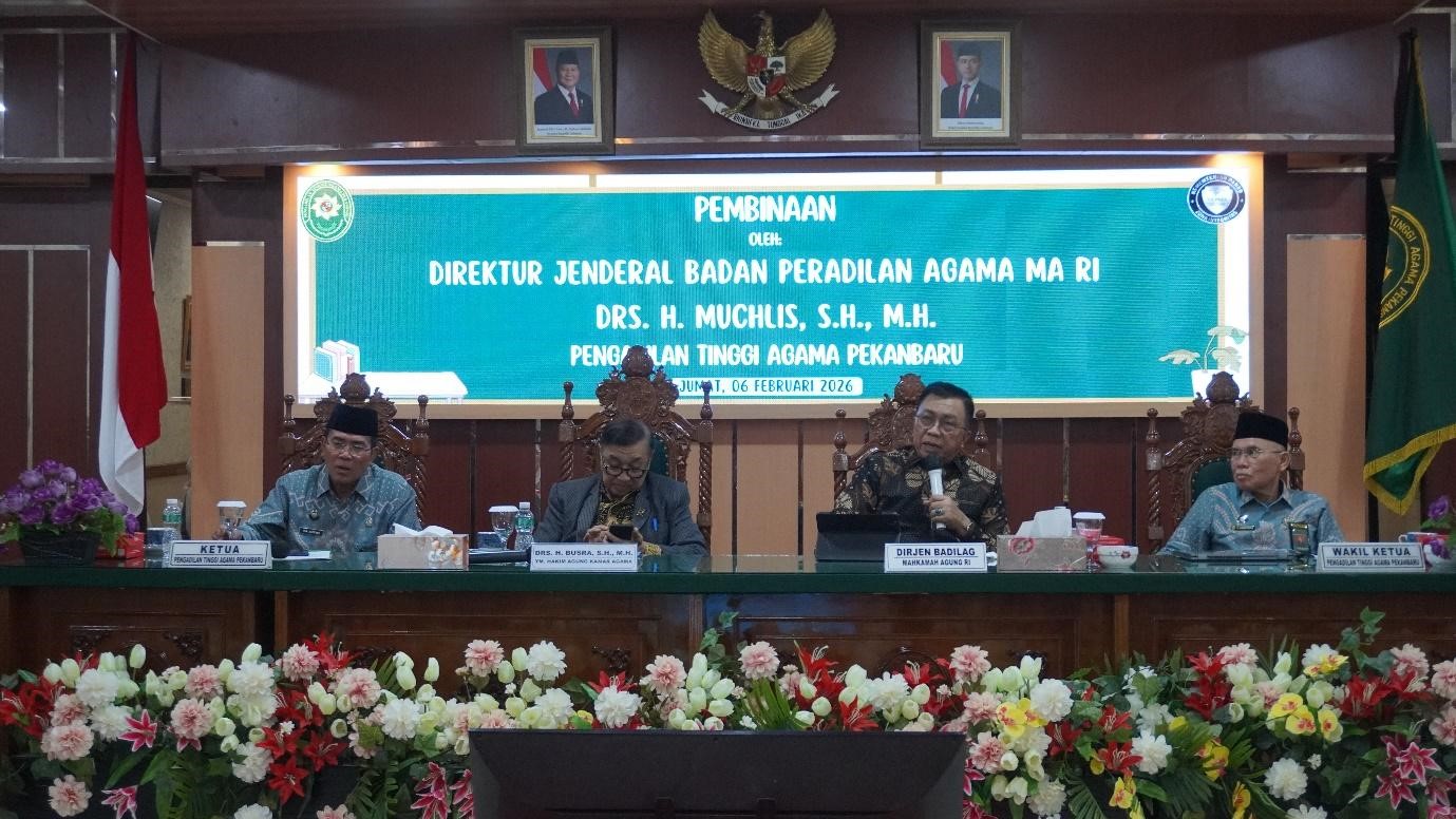 Bertempat di Aula Pengadilan Tinggi Agama Pekanbaru, kegiatan pembinaan tersebut dilaksanakan pada pukul 14.00 WIB dan disampaikan secara langsung oleh Direktur Jenderal Badan Peradilan Agama Mahkamah Agung Republik Indonesia Drs. H. Mukhlis, S.H.,M.H. Dalam arahannya, beliau menegaskan bahwa jabatan merupakan amanah yang harus dijalankan dengan penuh tanggung jawab, kerendahan hati, serta dedikasi yang tinggi.