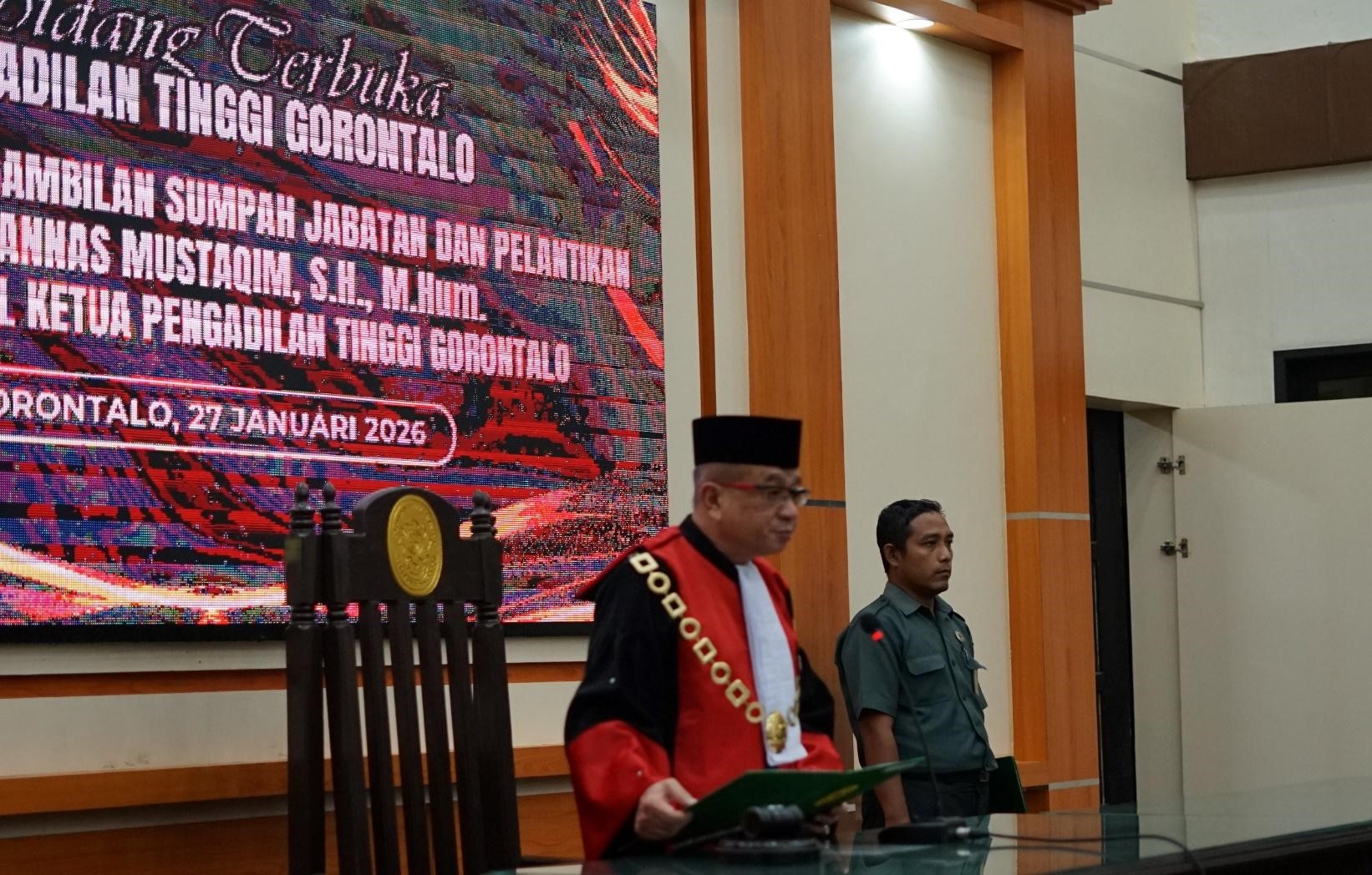 Gorontalo - Ketua Pengadilan Tinggi (PT) Gorontalo, Dr. Yapi, S.H., M.H., secara resmi melantik Annas Mustaqim, S.H., M.Hum., sebagai Wakil Ketua PT Gorontalo. Pelantikan tersebut dilaksanakan pada Selasa (27/1), bertempat di Ruang Sidang PT Gorontalo.