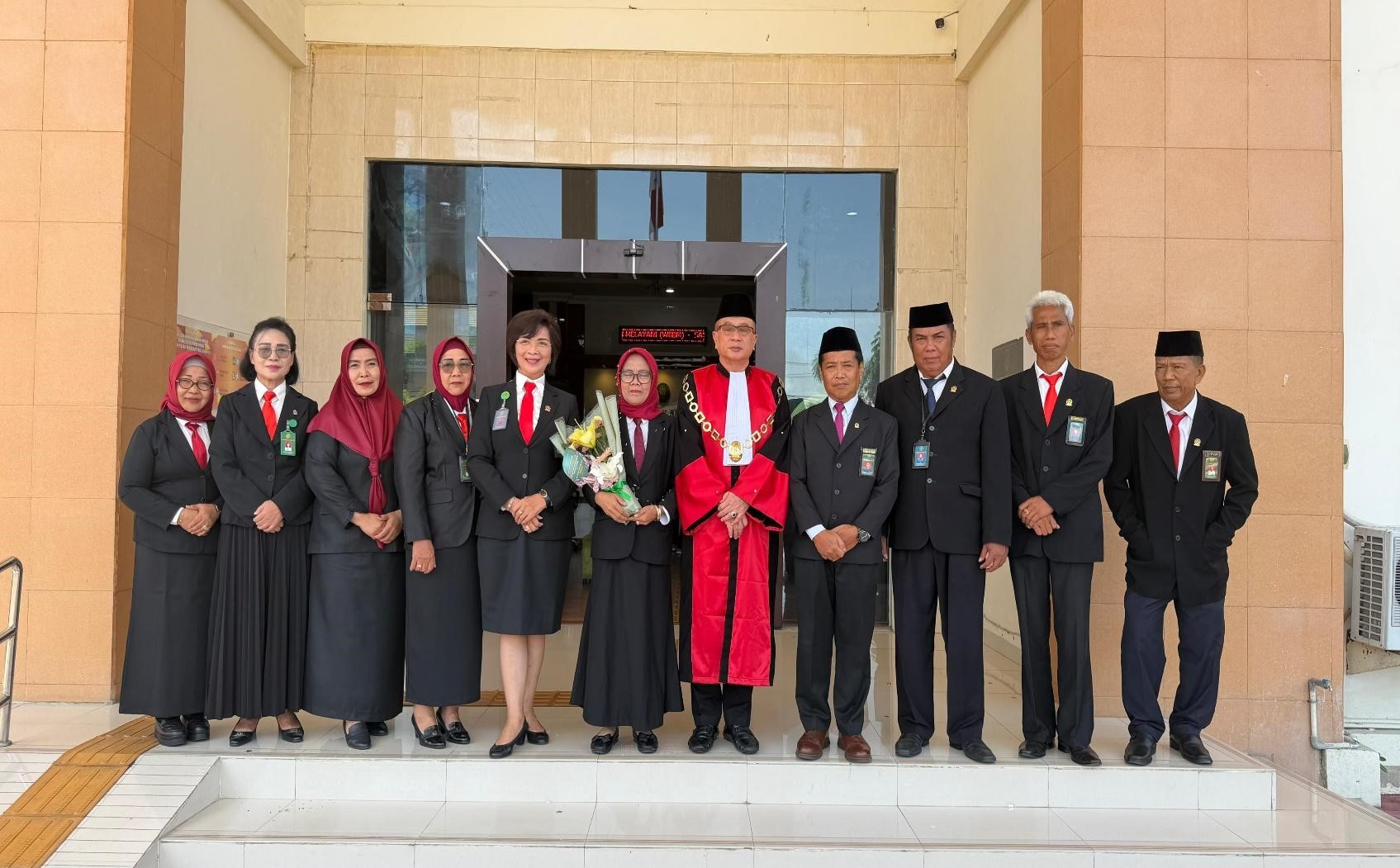 Sebagai penutup rangkaian acara, hadirin mengiringi prosesi pengantaran Ibu Halimah Pontoh, S.H., M.H., dan Ibu Ony S.Amai, S.H., dengan lantunan lagu “Tanah Air Indonesia”. Langkah beliau meninggalkan ruang sidang bukanlah akhir dari pengabdian, melainkan awal dari fase baru kehidupan yang sarat makna.