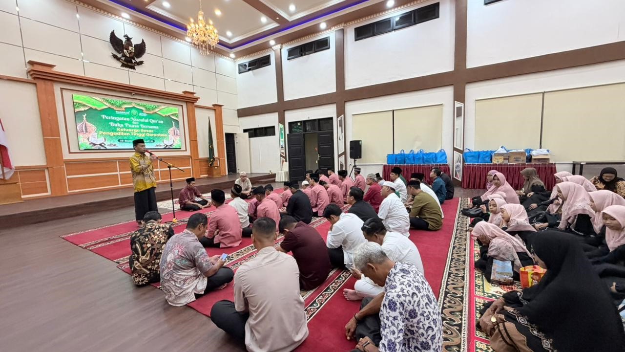 Ketua Pengadilan Tinggi Gorontalo, Dr. Yapi, S.H., M.H., dalam sambutannya mengajak seluruh hadirin memaknai peringatan Nuzulul Qur’an sebagai momentum untuk memperkuat keimanan sekaligus memperbaiki kualitas diri.
