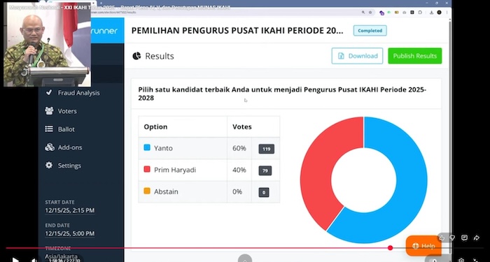 Pemilihan Ketua IKAHI tersebut dilaksanakan melalui mekanisme pemungutan suara secara elektronik (e-voting) pada Senin, 15 Desember 2025, di Hotel Mercure, Jakarta Utara.