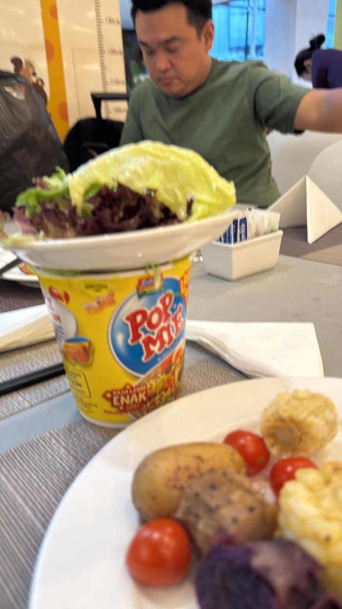 Sarapan di restoran hotel pun saya buat sederhana: Pop Mie yang dibawa dari Jakarta, ditemani dua telur rebus, umbi-umbian rebus, dan sedikit sayuran.